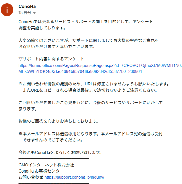 サポートを受けるとその翌日くらいに、ConoHaからサポートに関して以下のようなアンケートメールが届きます。