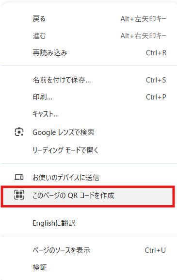 作成したいURLにアクセスした状態で、右クリックをし「このページのQRコードを作成」を選択するだけでQRコードを生成できます。